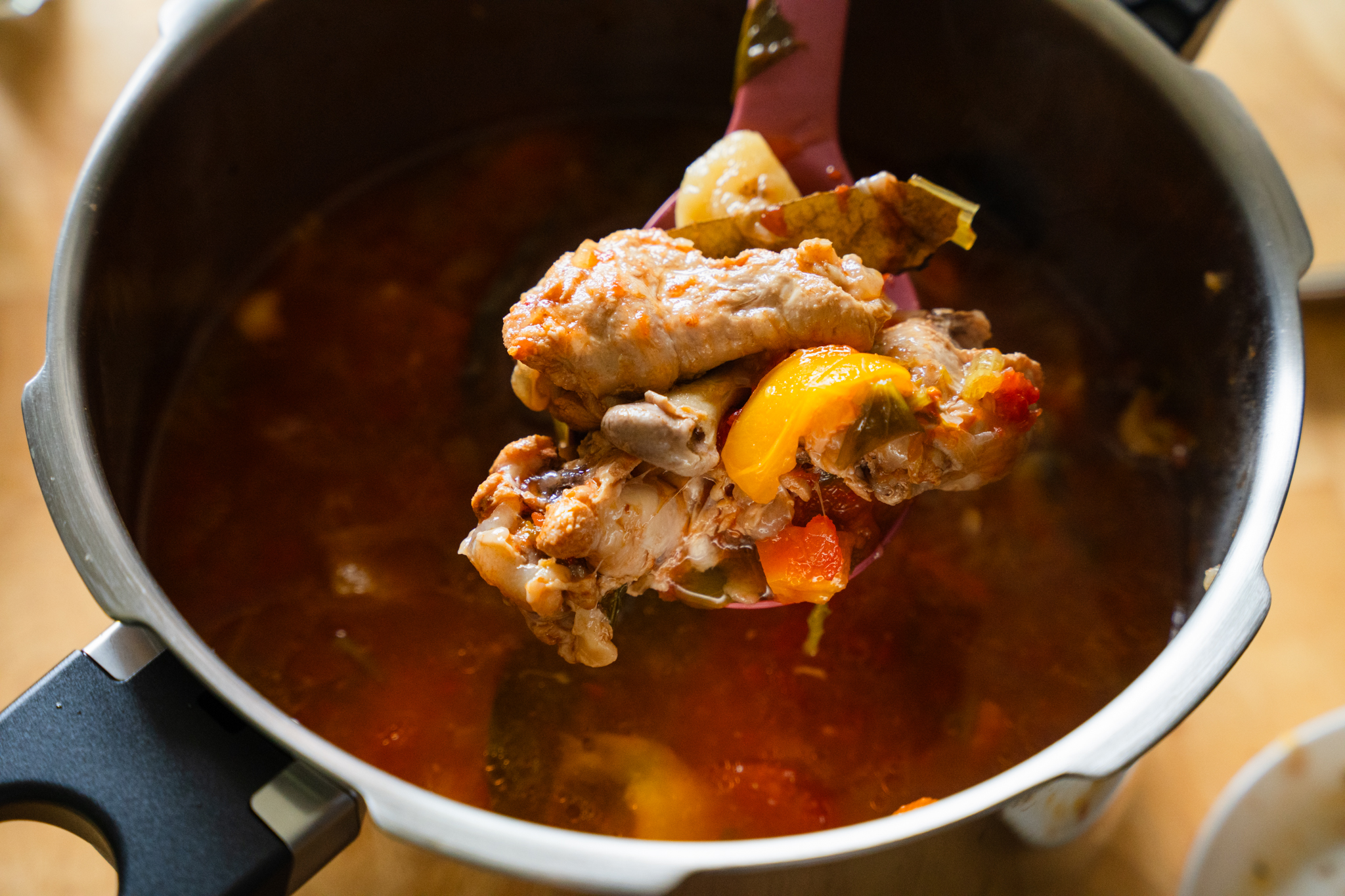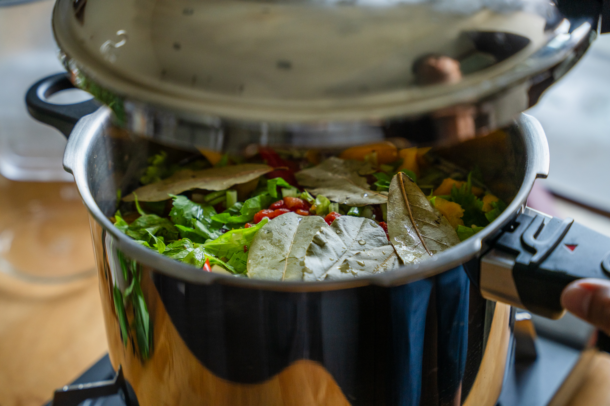 Step 4 再放一些黃椒和芹菜後,倒水和放月桂葉準備燉煮(因為是用高壓鍋快速悶煮用少量200 c.c.水就可以,平常鍋子約可加到食材一半慢慢燉煮)