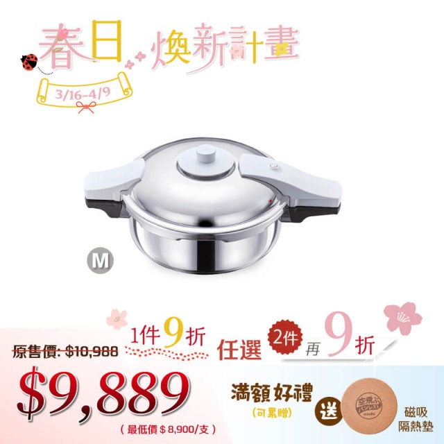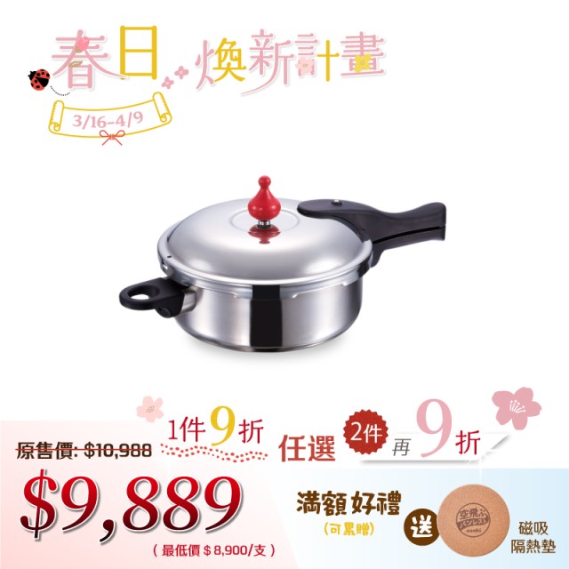 零秒活力鍋是家庭用壓力鍋中具有世界最高等級146kPa的壓力鍋,鍋內溫度可高達128℃,可將食物快速煮熟。因為使用少許的水就可以料理,可以更快煮沸,一體成型的5層複合鋼金屬結構※可由鍋身四面八方均勻導熱,因此關掉火源利用於熱悶煮即可!