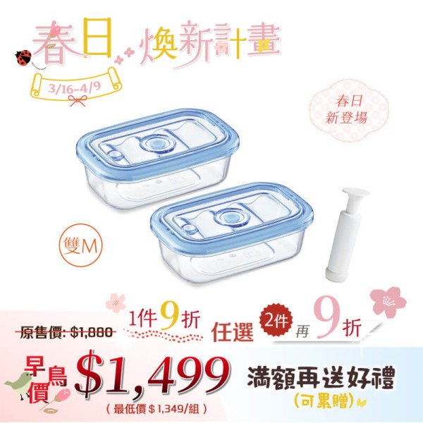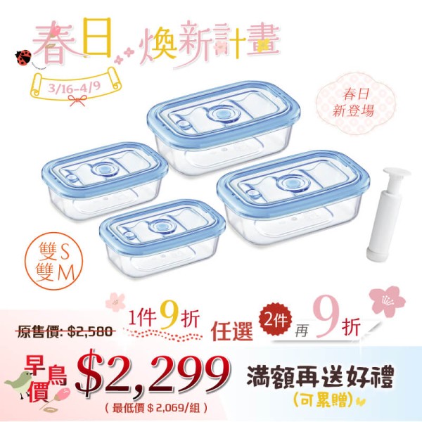 【春日煥新】純淨真空保鮮盒(雙S)(雙M) + 真空棒