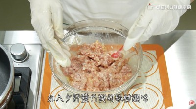將瘦豬絞肉、洋蔥丁與蛋液放入大碗中,加入鹽與胡椒後均勻攪拌,並持續摔打絞肉使其更有黏性、口感更紮實。