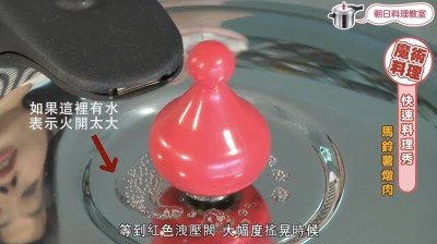 開中大火,等待紅色配重大幅左右搖晃後立刻關火。等待壓力指示器下降,取下紅色配重閥、打開鍋蓋,你會發現——馬鈴薯已經鬆軟入味!